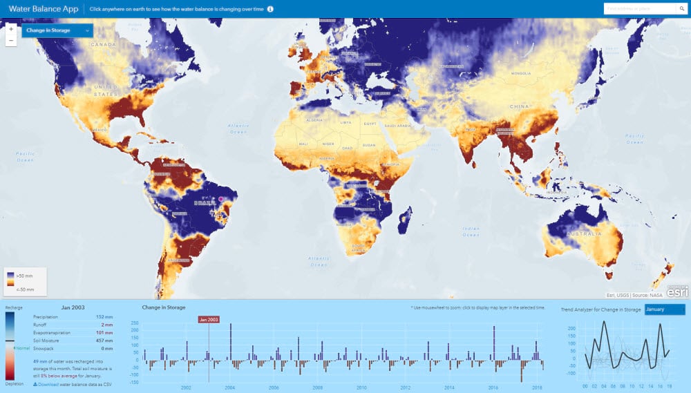 Depletion is not necessarily a bad thing, of course. It is common for landscapes to store water during the rainy season, and dry out before the rains come again. The ecology of a region is adapted to this natural water cycle. A problem only arises when that cycle breaks. Perhaps the summers become too hot, or the rains come less often. Changes like these are becoming more common as global climate cycles are disrupted by anthropogenic influence. In order to help understand how our influence is affecting these regional water cycles, Esri built the Water Balance App. This application is combines all of the GLDAS layers into a single application with an intuitive interface and useful analytics.