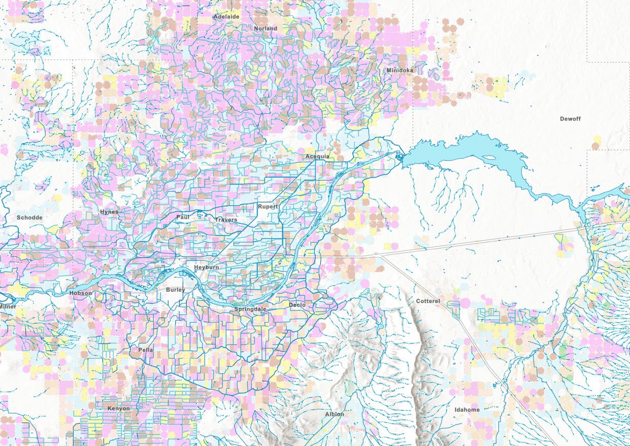 The NHDPlus High Resolution layer displayed with USA Cropland reveals the relationship between Lake Walcott, Minidoka Dam, and fields of potatoes, alfalfa, barley and other crops in Southeastern Idaho.
