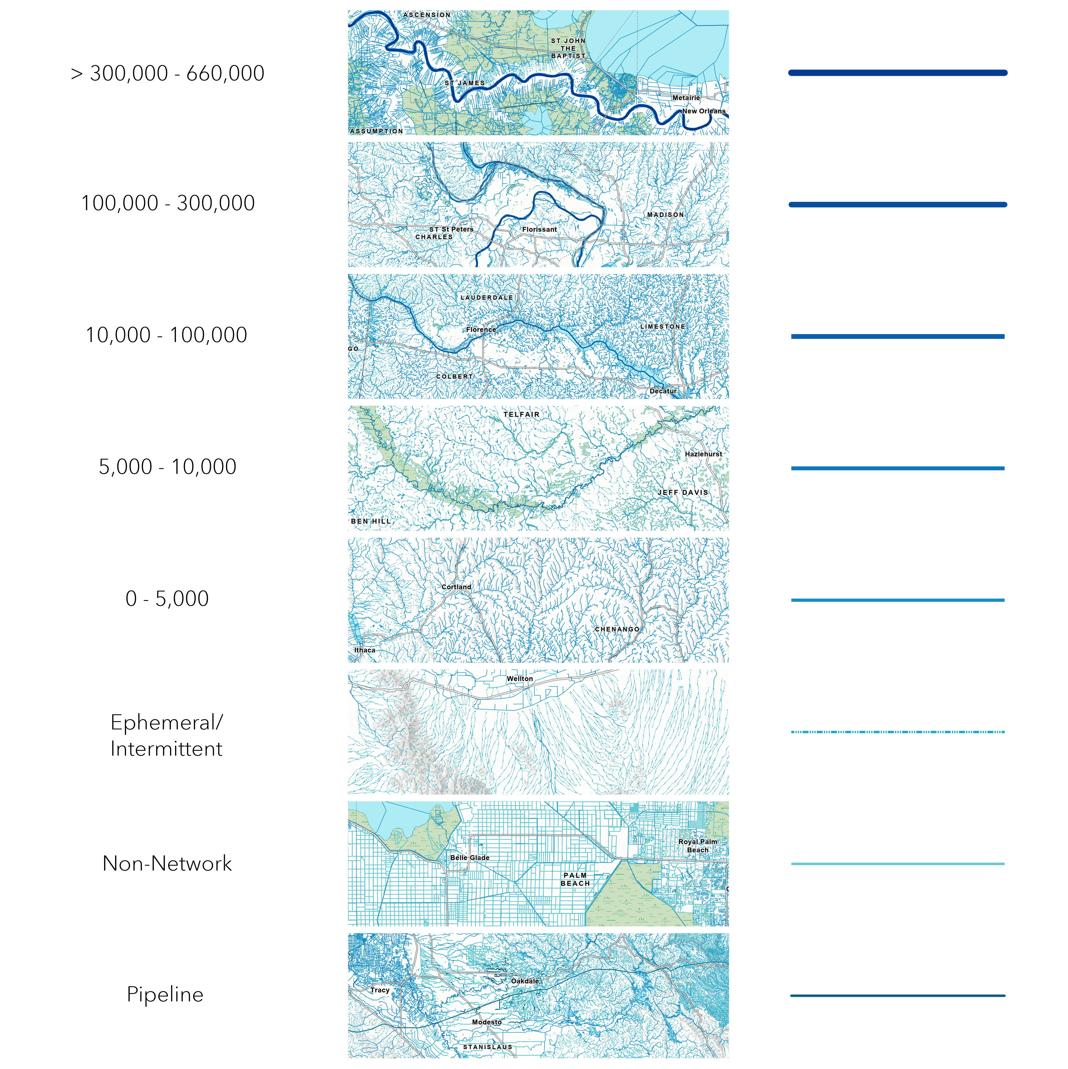 In order to classify the lines appropriately, ephemeral and intermittent drainages were pulled out and symbolized with the classic hatched line. Pipelines and non-network features were styled using a conscious use of color so that the viewer can differentiate them across the landscape at varying scales. Streams and rivers were represented with an sequential blue palette along with a stroke size that increases and mimics their amount of mean annual flow.