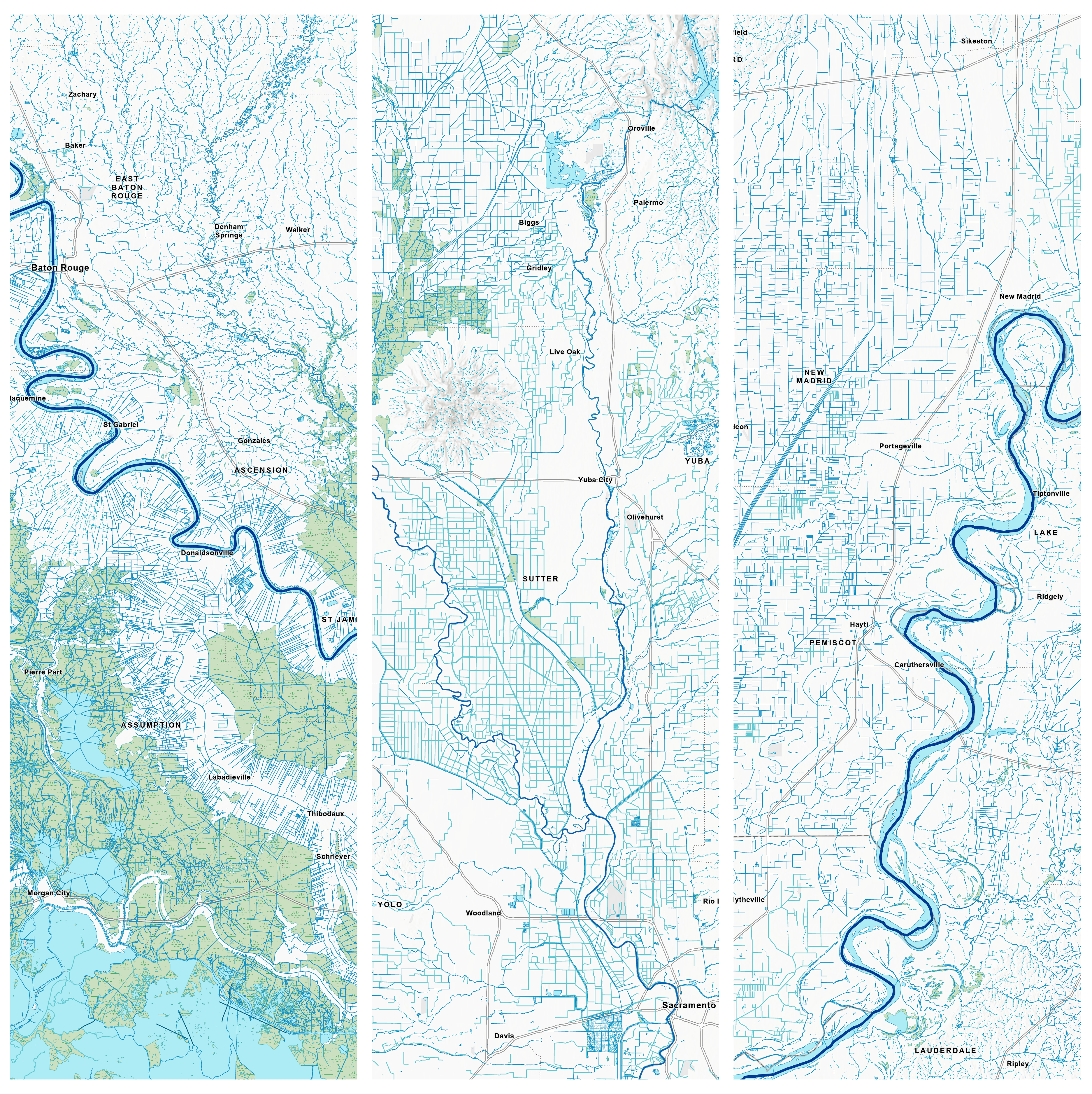 Across the landscape, waterbodies reflect patterns of human development. On the left, the many straight lines reveal extensive engineering to drain lands in southern Louisiana while similar straight lines in the center map show the extensive irrigation systems that support the rich agricultural lands in California’s central valley. On the right, we see similar water systems that support agriculture along the Mississippi River in southeastern Missouri.