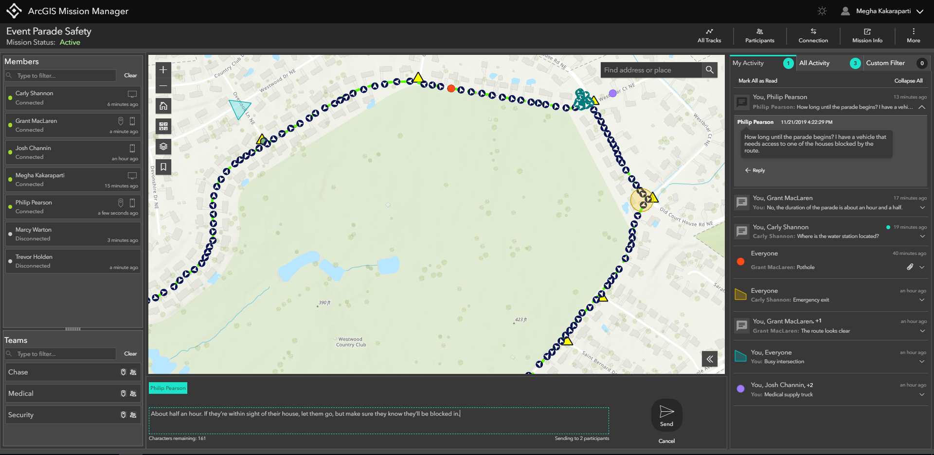 ArcGIS Mission Responder allows mission engagement through a mobile app for users in the field. Responder helps participants maintain communication and awareness of each other by providing peer-to-peer communication tools and geolocation tracking for every mission member. With the Responder app, you can send chats, geomessages, and map tools, as well as view your updated mission feed in near-real time. The Responder app is available in the Google Play Store for Android, and the iOS version is shortly to follow.
