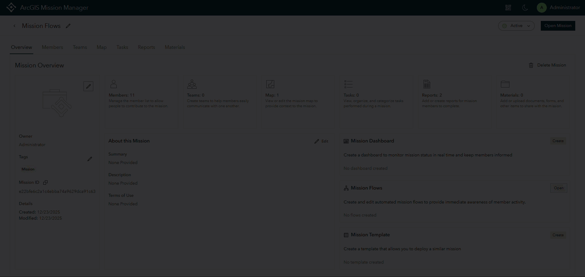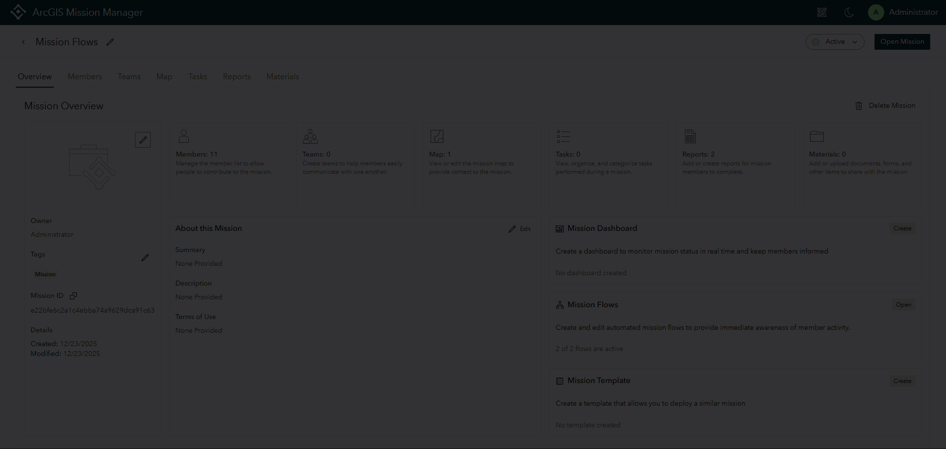 Mission Flows extend communication across ArcGIS Mission in the forms of system messaging and log recording. These flows are constructed by the Mission Owner or Admin and consist of a source of mission data, a condition, and a resulting action.