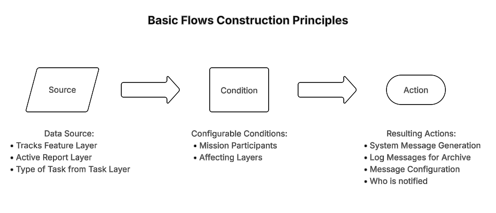 All Flows can be started when any or select mission members are designated. Each of these can also produce a system message as well as a log record of the flows action. Custom messages can be configured as well as designating who sees these different messages.