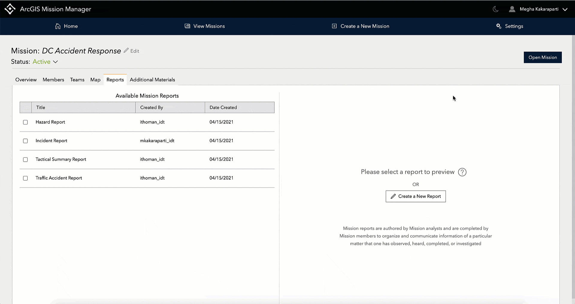 At the ArcGIS Mission 2021 Q2 release, we enhance the capability of reports by introducing the ability to create custom reports with different fields that apply to your mission’s purpose. These reports are created and published in ArcGIS Mission Manager by the mission owner or a portal administrator. When a report is created, you have the option to share it with your organization so others can leverage it as a template for a new report in a different mission. A Mission Report item and hosted feature layer is created in your portal each time a custom report is published. Once reports are submitted by mission members, they are displayed in a feed and displayed on the mission map. These reports can also be required as part of a mission task to help streamline the assignment of work .