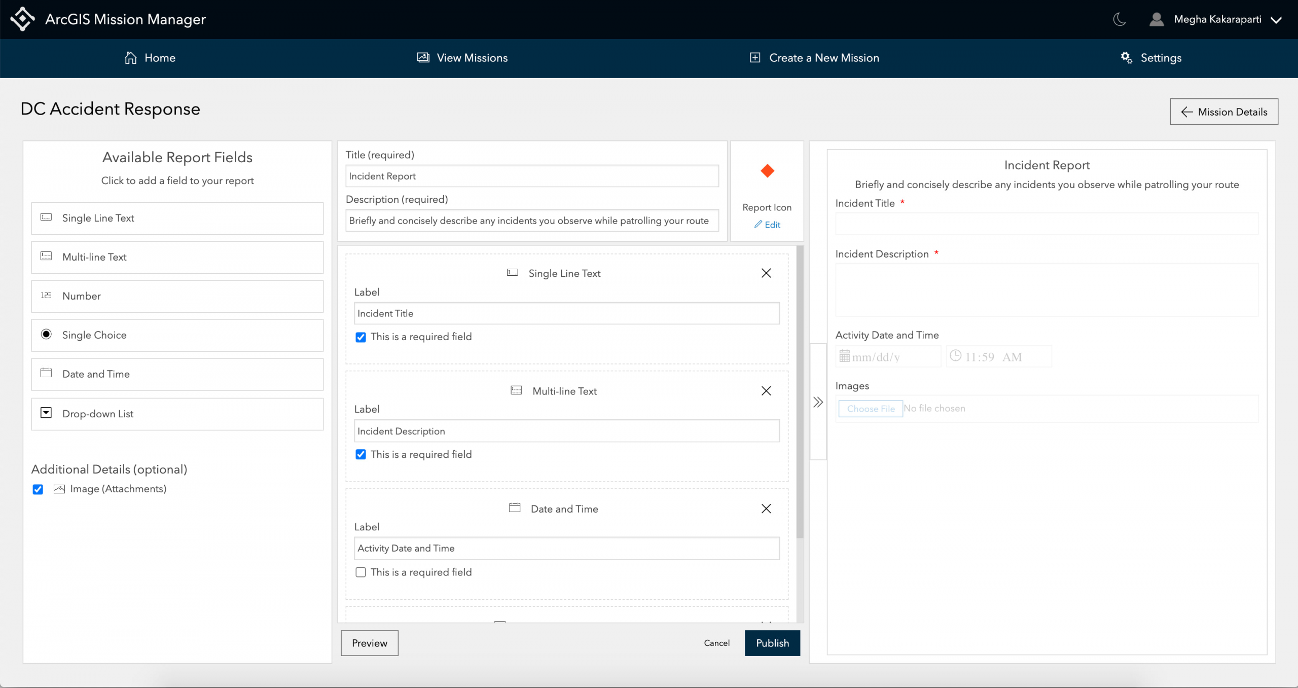 Along with these field choices, you have the option to enable attachments on the reports layer, allowing members to include .jpeg or .png files when submitting their report. To visually customize how the report is displayed on the mission map, you change the report icon to fit the needs of your mission to include a color, shape, or size. Prior to publishing your report, you can preview it so you can see how it will look.