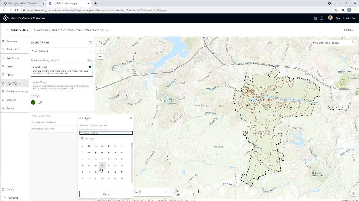 Whether initiating a mission from scratch or continuously running a routine one, most operations rarely finish as they begin. During continuity of operations, organizations may receive updated information providing additional context to field teams about their surroundings. These updates can play a pivotal role in helping field personnel accomplish their missions in a more effective manner. In 10.9.1, Mission Manager map editing tools have been expanded enabling users to edit the mission map without having to leave the mission environment. Some key features in map editing include styling icons, configuring pop-ups, and adding published content from your portal or web service layers.