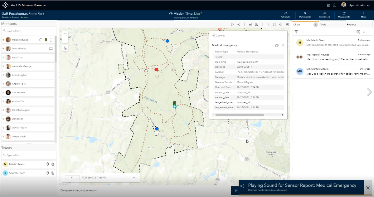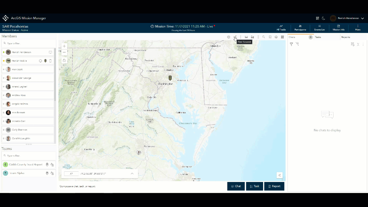 Nothing is more important than knowing where your field personnel are especially in an emergency. ArcGIS Mission 10.9.1 utilizes several enhancements that make finding the responders you need when you need them. Some of these enhancements include the use of portal profile avatars and enhanced symbology based on presence. Additionally, proximity tools are built into Mission Manager enabling managers to quickly find the nearest responders to an event or incident for rapid response and quickly make contact with them for assistance in areas of need.