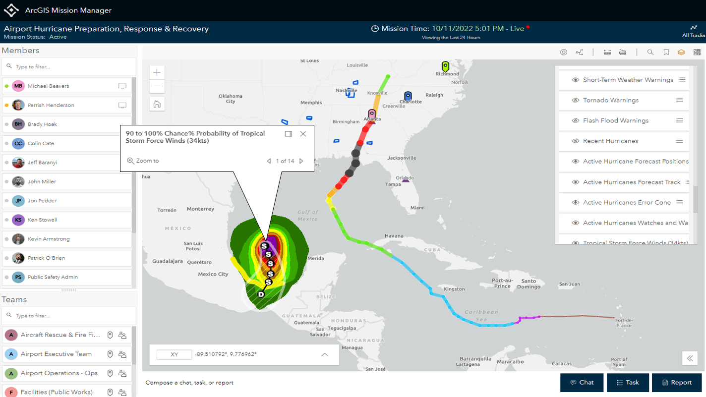 ArcGIS Mission enables airports to prepare, respond, and recover from extreme weather events, like hurricanes, using location-based technology that helps save time and properly allocate resources in urgent situations. Preparing staff at an airport requires a holistic view of emergency protocols and logs of facility vulnerabilities like flood risk areas and infrastructure in need of maintenance. With ArcGIS Mission Manager (ArcGIS Mission’s web component) you can activate a mission at the start of Hurricane season that includes live weather and other dynamic data feeds as well as important operational information, like emergency protocol PDFs, for easy access by your staff in the Mission Responder app (ArcGIS Mission’s mobile component.)