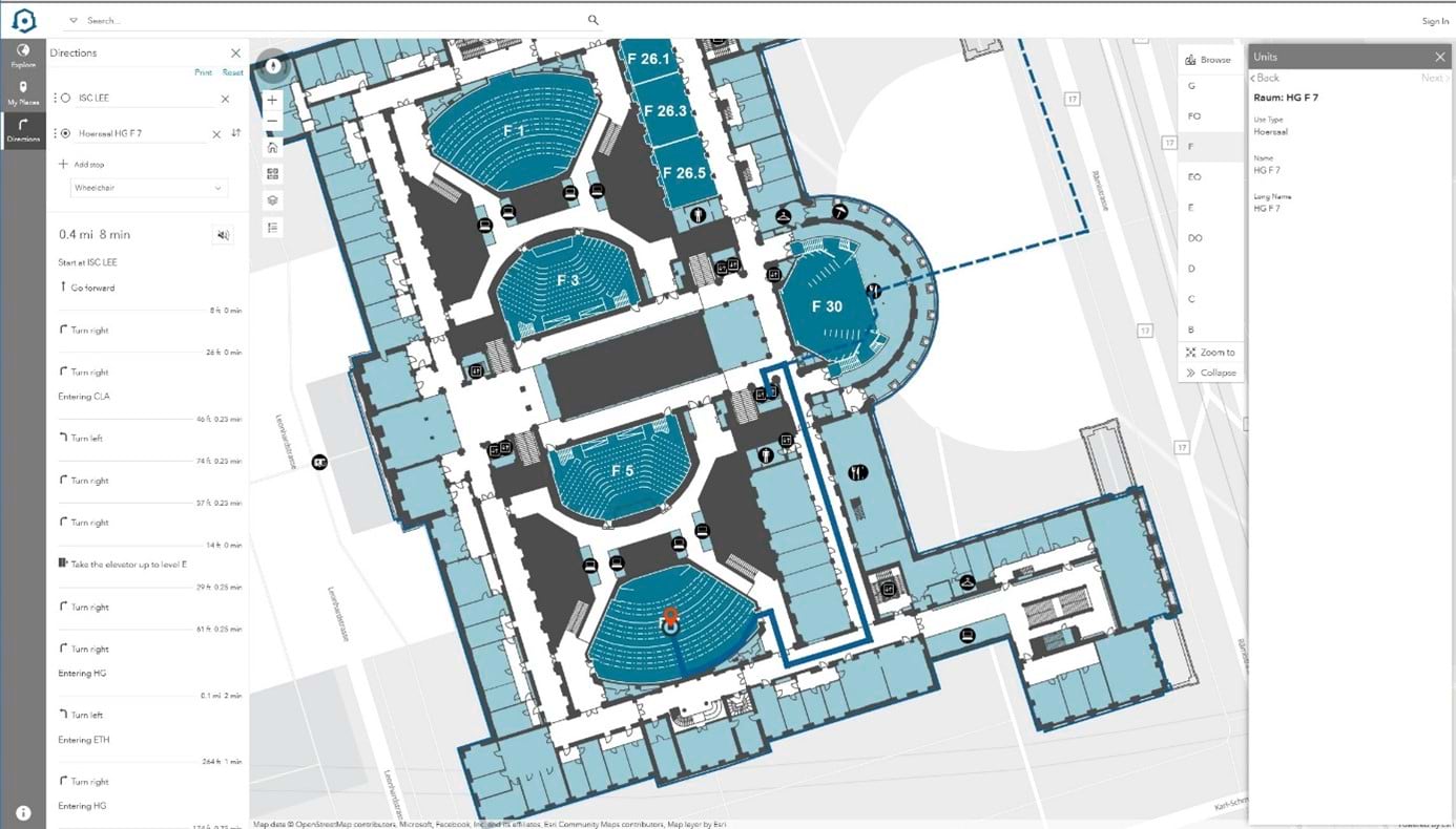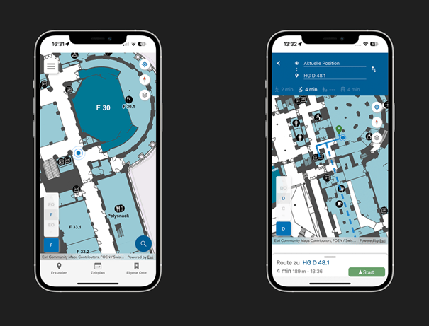 If you want to navigate from one room to another at ETH Zurich, you may have to navigate between buildings. Esri’s indoor positioning system allows seamless transitions between indoor and outdoor positioning based on GPS signals. As the university campus is spread across multiple sites in Zurich, navigating across these distances also plays an important role in the overall barrier-free experience and brings other organizations into play, who are responsible for those spaces.