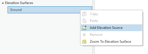 Next add the elevation data to the scene. In this sample it is the same data that is under the 2D Layers section of the Contents pane. Right click on Ground under Elevation Surfaces and click Add Elevation Source to add the the elevation data to the scene.