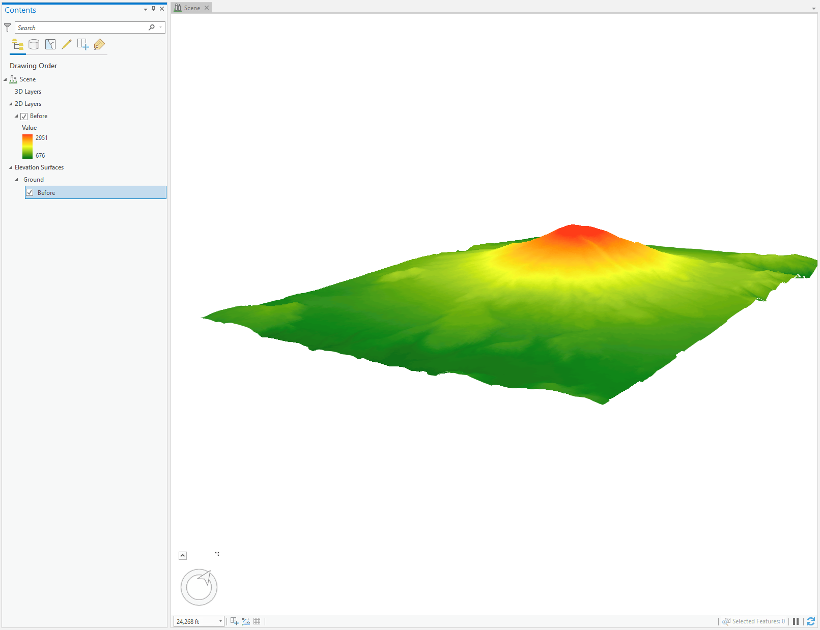 I then added the raster named “Before” to the scene and have the scene clipped to the extent of the data. Having this operational layer added will help give reference to the elevation layer we are publishing. I also adjusted the color ramp used from a grayscale to green-red color ramp.