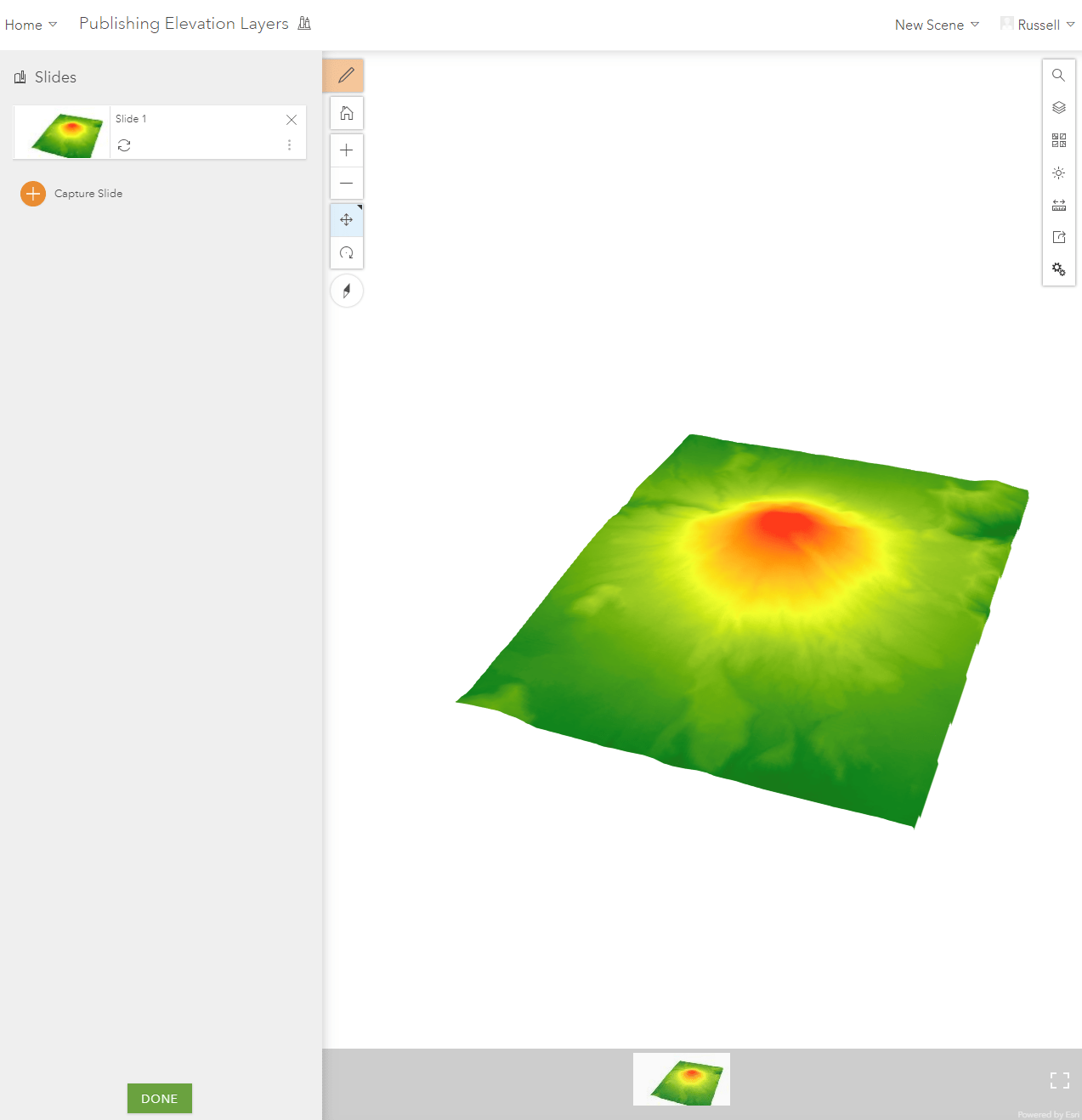 Even though the web scene was created in ArcGIS Pro I can also make changes to this web scene in Scene Viewer. I can adjust the background of the web scene to just white so I see no blue sky in the horizon when I tilt the camera. I am also going to add a few slides to each this web scene to help viewers navigate my web scenes that might not be familiar with navigating in 3D. To create slides simply click on the Slides button in the Designer Pane, then click Capture Slide. This will save the current view you have in the scene. Once all the slides are captured just click Save to update the web scene.