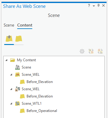 With all the layers added to this scene we can begin publishing a web scene and its layers to ArcGIS Online. With ArcGIS Pro 2.3 all you need to do is go to the Share tab, click on Web Scene and under the Share as a Web Scene pane we can see all the layers being generated when we share to ArcGIS Online.