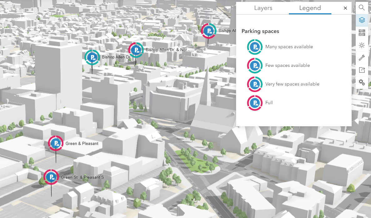 If you know your way around in vector graphics programs, you could even go a bit further and design more complex icons. Here’s an example of icons representing parking availability (the parking locations are correct, but the availability is data that I invented):