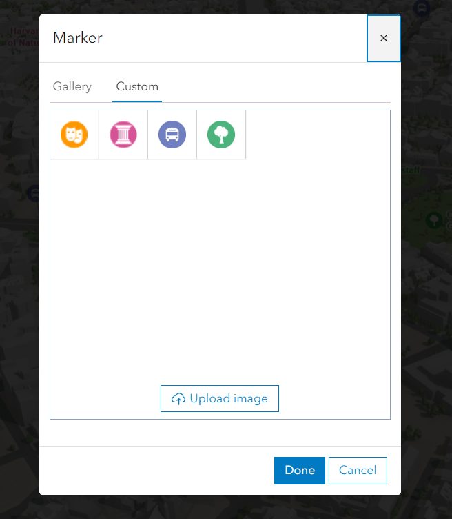 From the Calcite library I used icons for theatre, tree, bus and museums. In a vector graphic design program I then added a background circle to make them stand out and visible against any background (sky or ground). I uploaded the icons by clicking on the point layer -> Choose a drawing style -> 2D Marker -> Marker menu -> Custom: