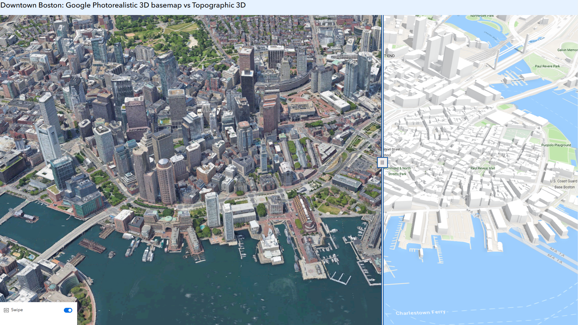 This Experience builder app exhibits the comparison between Google Photorealistic 3D Basemap (left) and Topographic Basemap (right) in downtown Boston.