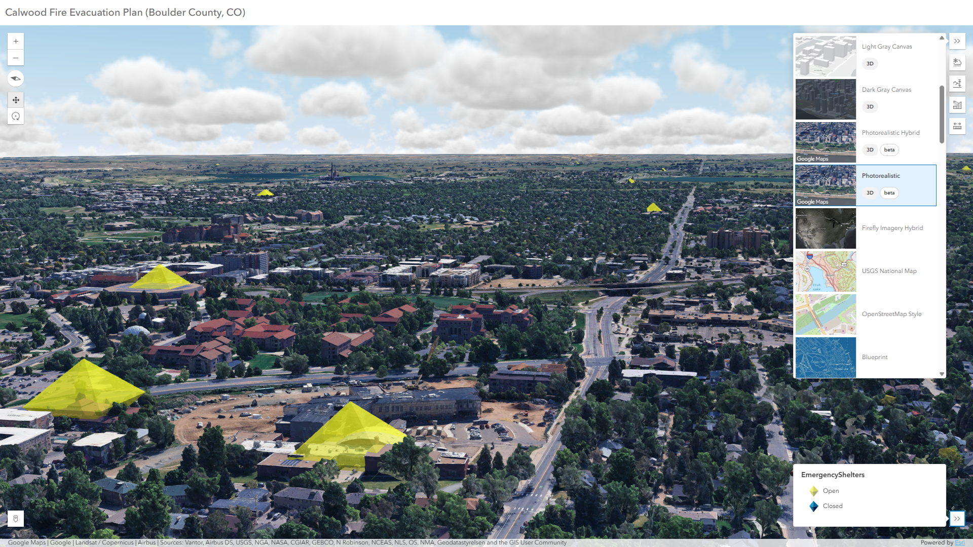 This Instant Apps 3D Viewer app expediates real–time evacuation planning, when overlaying a point feature layer with the Google Photorealistic 3D Basemap from the basemap gallery
