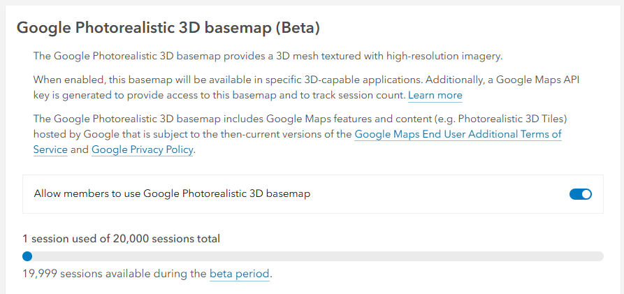 Option to enable access of the Google Photorealistic 3D basemap, and monitor the session usage in organization settings