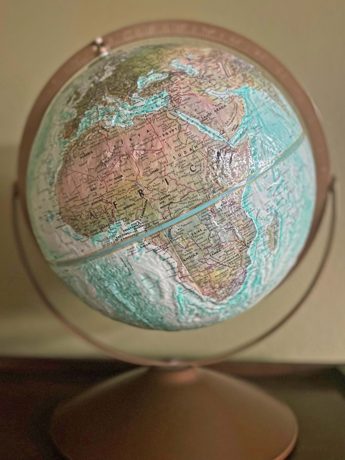 I remember my first rotating globe very well, my parents bought it for me when I was in elementary school. It was a raised relief globe, with topography and bathymetry you could see and touch. Whenever I learned of events in the news, I’d spin the globe to see where in the world those were happening. I still have it; it’s part of my home office decor that you might see in the background during a Teams or Zoom meeting.