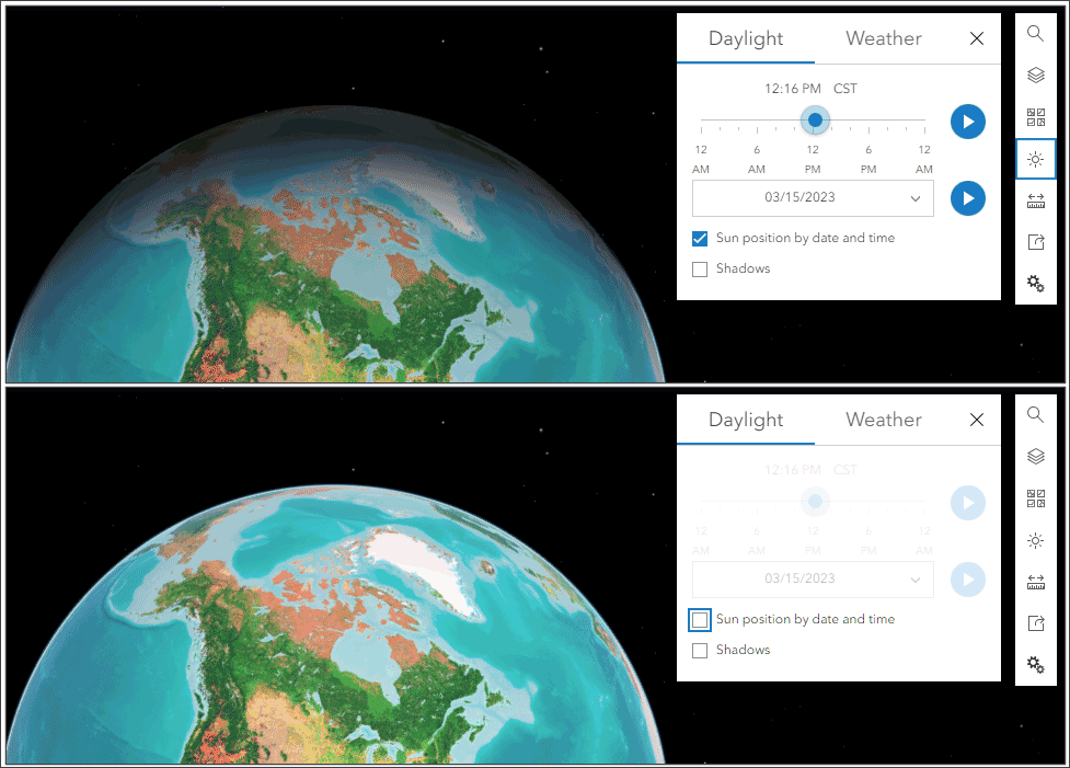 Tip: Experiment with turning the Sun position by date and time off (it is on by default). This will influence the appearance of the globe.