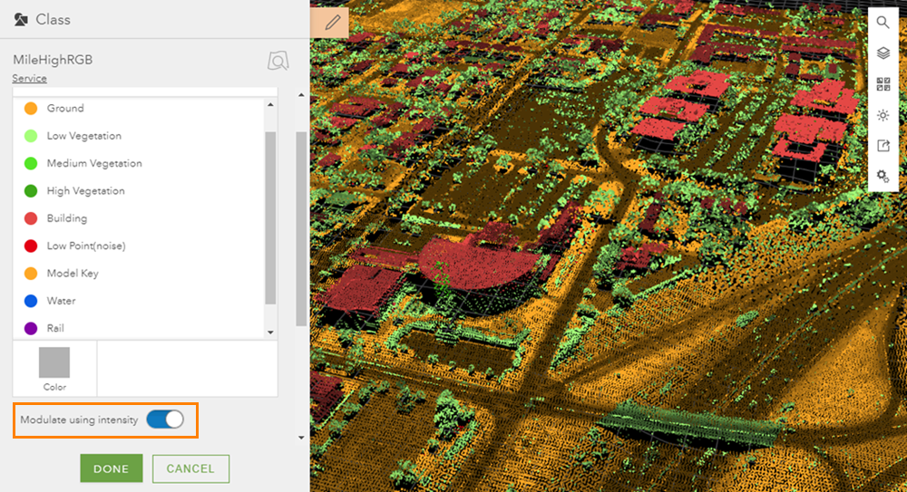 Hint: If I turn the “Modulate using intensity “option on, I can shade the color of the points based on the intensity value (see the Intensity style below). This improves depth perception and perspective of my point cloud scene when many nearby points have the same color. By adding this option and playing around with the class colors, I can see much more detail, such as the roads and roof structures.