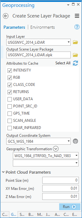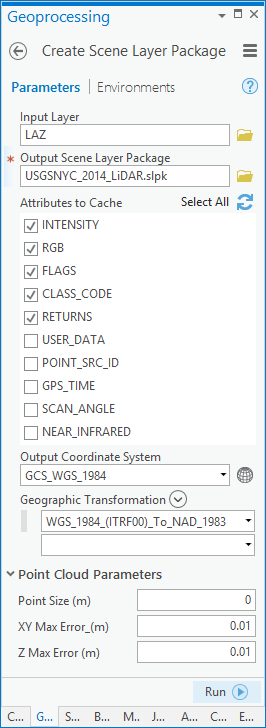 To convert the LAS ZLAS or LAZ point cloud data into a PCSL SLPK. Open ArcGIS Pro, navigate to the “Create Scene Layer Package” geoprocessing tab. Drag the folder containing the LAZ files into the input Layer dialog. Select an output folder. Define what attributes to cache. Finally select the output coordinates or use the default GCS_WGS_1984 which transforms the input projection, in this case NAD 1983 to WGS 1984.
