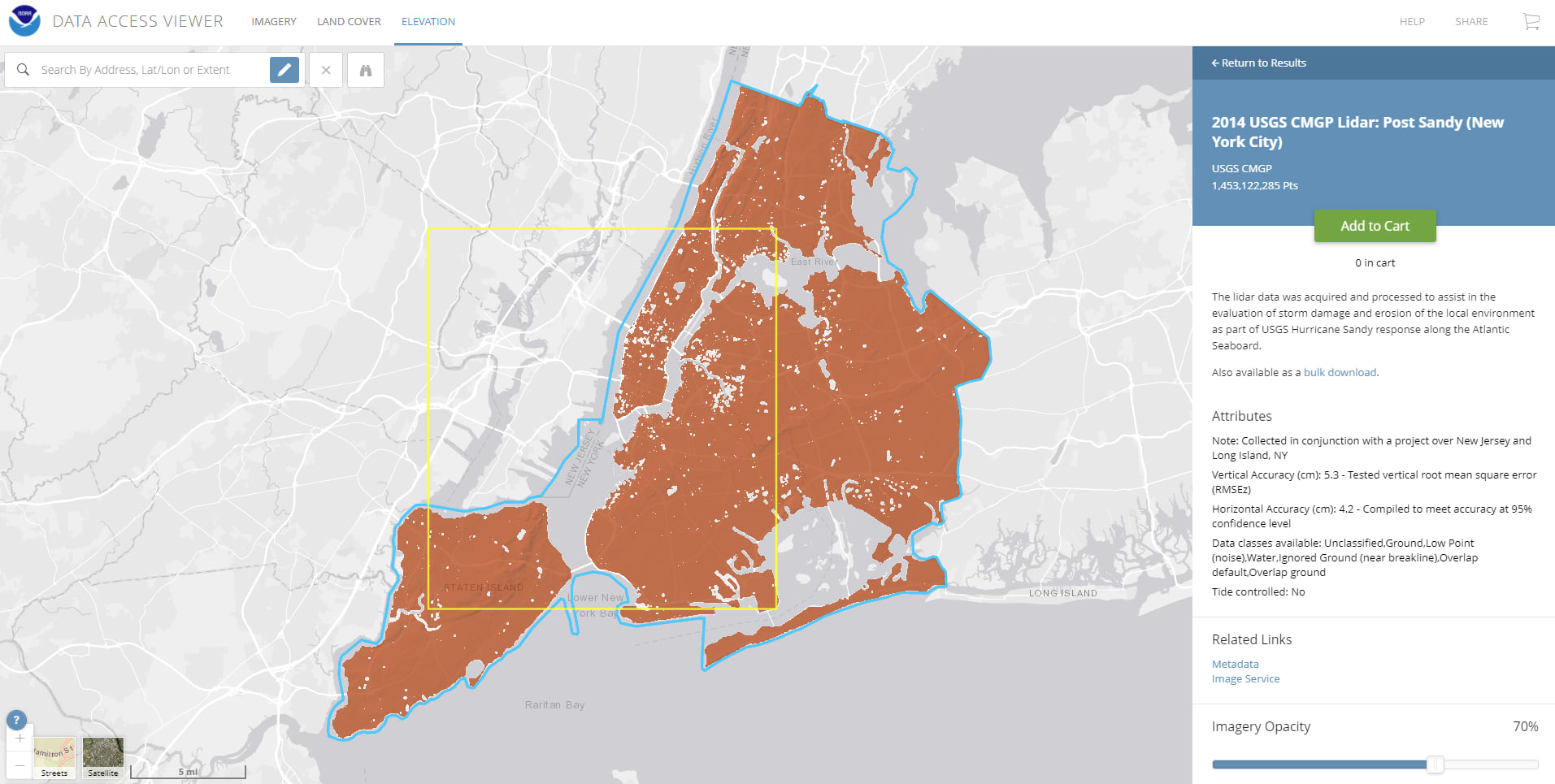 Selecting the New York vicinity provides you with the all the information to download the LiDAR data and full metadata on its collection and processing.