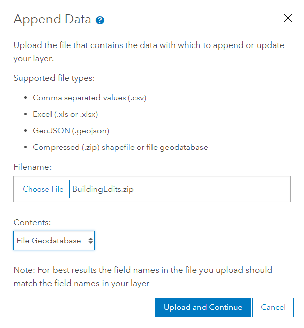 Clicking on the Append Data to Layer option will display the modal view where we will upload the updated data. In the geodatabase I am using only contains the one building that has the change.