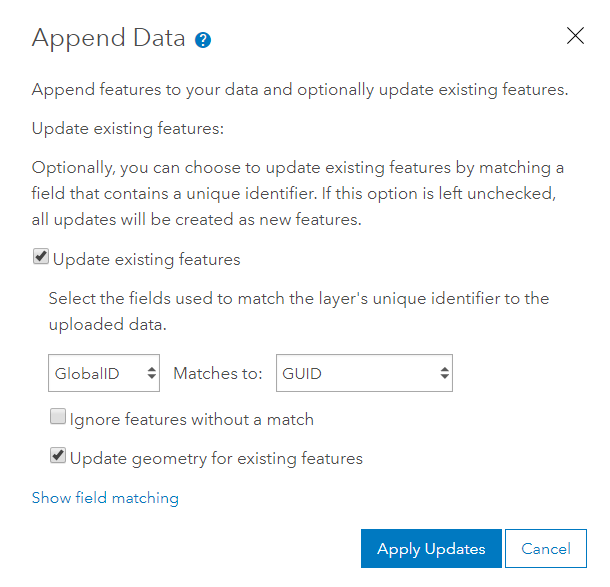 Next choose the option to Update existing features and in this case I am matching the GlobalID from the Feature Layer to the GUID in the uploaded feature class in the gdb and click Apply Updates.
