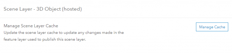 Now go to the scene layer associated to this feature layer. You can quickly go to the scene layer linked to this feature layer by clicking on the link to it in the Details section of the item details page for the feature layer. On the scene layers settings tab at the bottom of the page click on Manage Cache. This will bring up the rebuild options available for this scene layer.