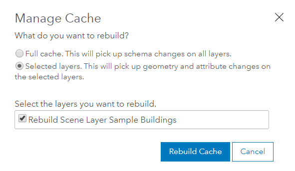 For this case the scene layer is only picking up edits and no schema changes. This means the scene layer will use the second option in the dialog to pick up attribute and geometry changes. When ready to begin the updating process click Rebuild Cache. If this scene layer had multiple layers and only one of the layers was edited we could select just the edited layer, this will then only rebuild features in the selected layer and not require the same number of credits to rebuild the entire layer if there were multiple layers in the scene layer.