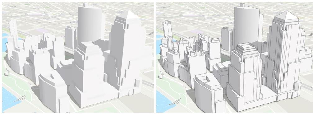 Use Edge rendering to make your scenes look stunning! This new enhancement allows you to style your building (3D Object) scene layers, with or without textures, by adding outlines (edges) to the building shapes. The edges will improve depth perception and help you clearly see the details of the features within the scene layer. To enable edges, simply switch on the Edges toggle in the configure layer panel and the layer will update automatically.