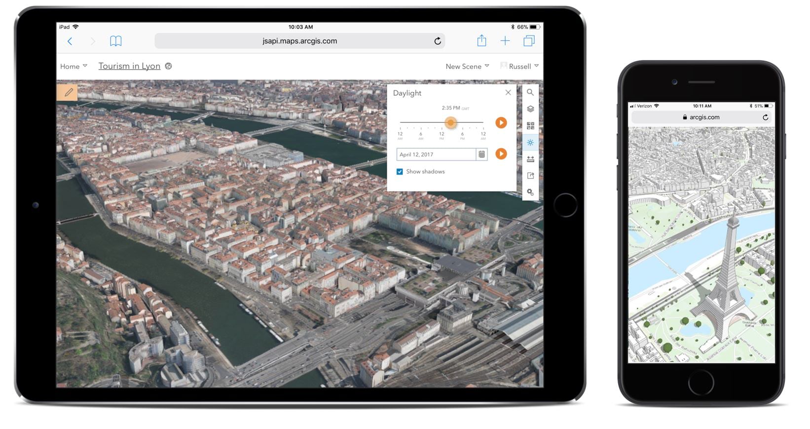 Scene Viewer has been widely used on desktop browsers since its initial release. With this release, now you can now check out your scenes on your modern phone or tablet. We’ve optimized the responsive UI of Scene Viewer for a light viewing experience on phones. On tablets, you can create and update scenes or use tools such as Daylight or Measure. Scenes support touch gestures for easy navigation such as zoom, pan, rotate, and tilt and they load and render fast (read more below in the performance section). Access these web scenes on the new and improved ArcGIS Online mobile site or through a shared URL.