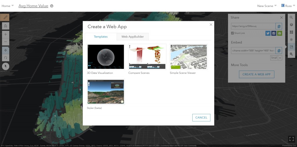 Use the share widget to create a web application from your web scene directly in Scene Viewer. Pick from the available web application Templates or create a new WebApp Builder application where you can configure it further and use your organizations defined theme.