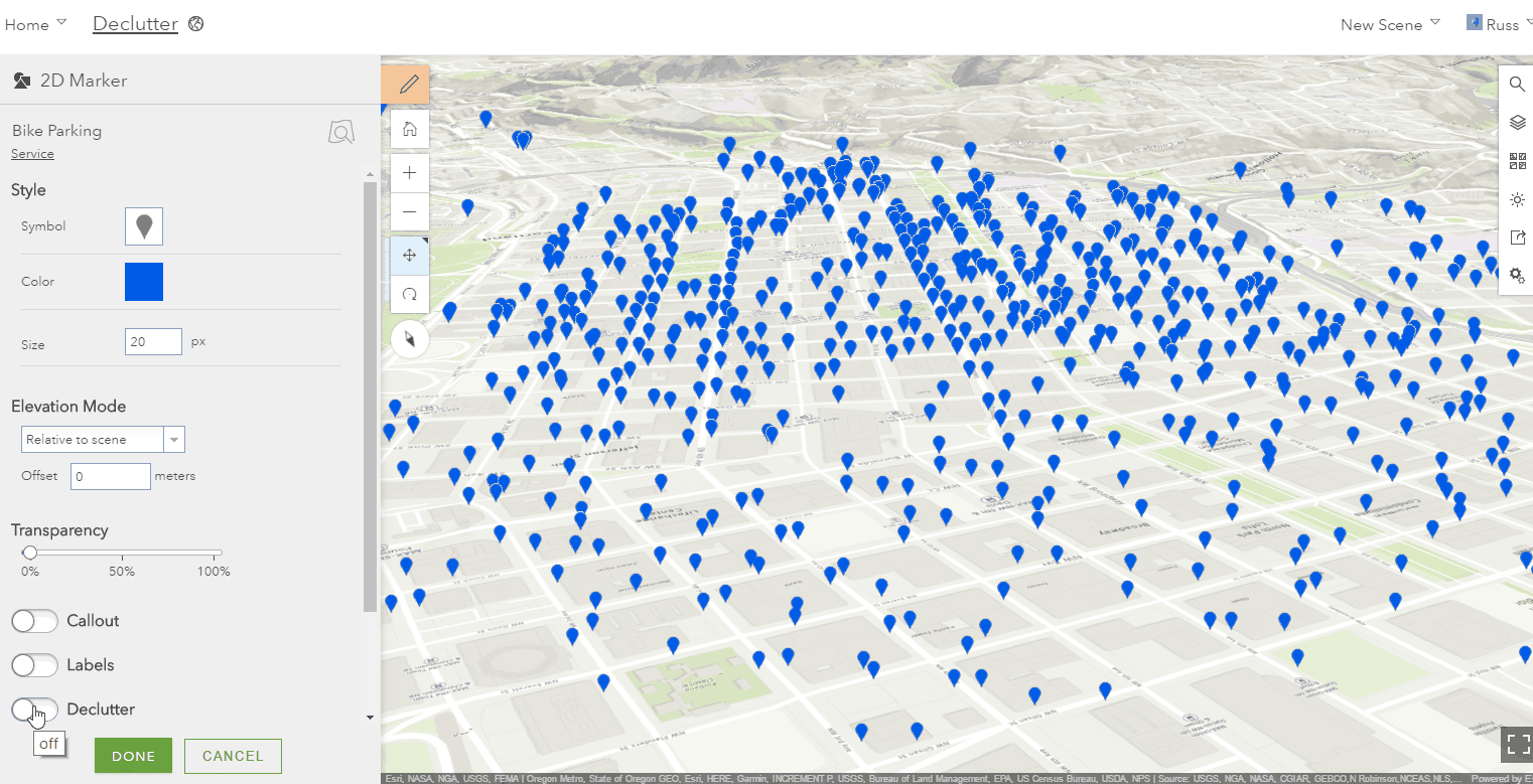 The Declutter setting allows you to automatically declutter the view by hiding points that overlap as you navigate the scene.