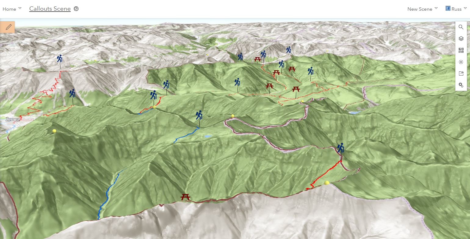 Turn on the Callout option to improve the perception of icon locations in the 3D scene: the vertical callout lines connect point symbols to the location of the feature they are describing, and the vertical offset helps with the visibility of points that would be otherwise behind or in between buildings or mountains. Combine this option with “Relative to Scene” elevation mode to get the best results for points within buildings.