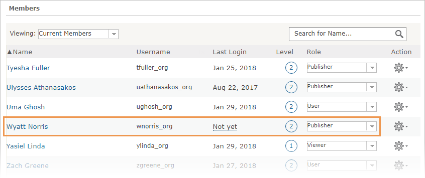 I added Wyatt to our organization as a Level 2 member. I gave him the Publisher role so he could share hosted web layers.