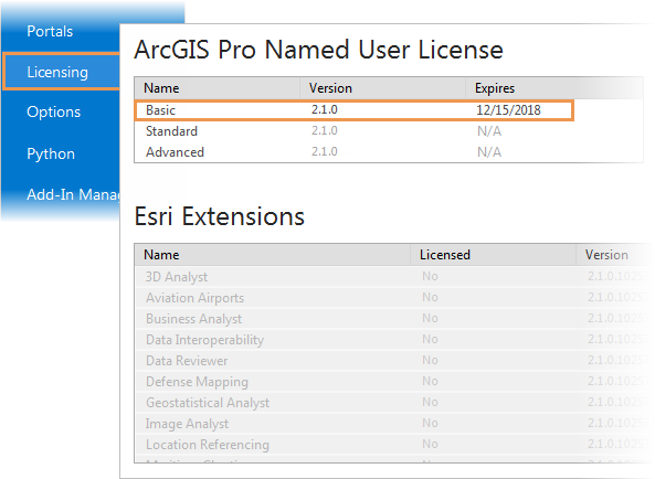 When he restarted ArcGIS Pro and checked the Licensing page, he had an Advanced license and a bunch of extensions.
