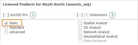 ArcGIS Pro license level and licensed extension check boxes for selected user