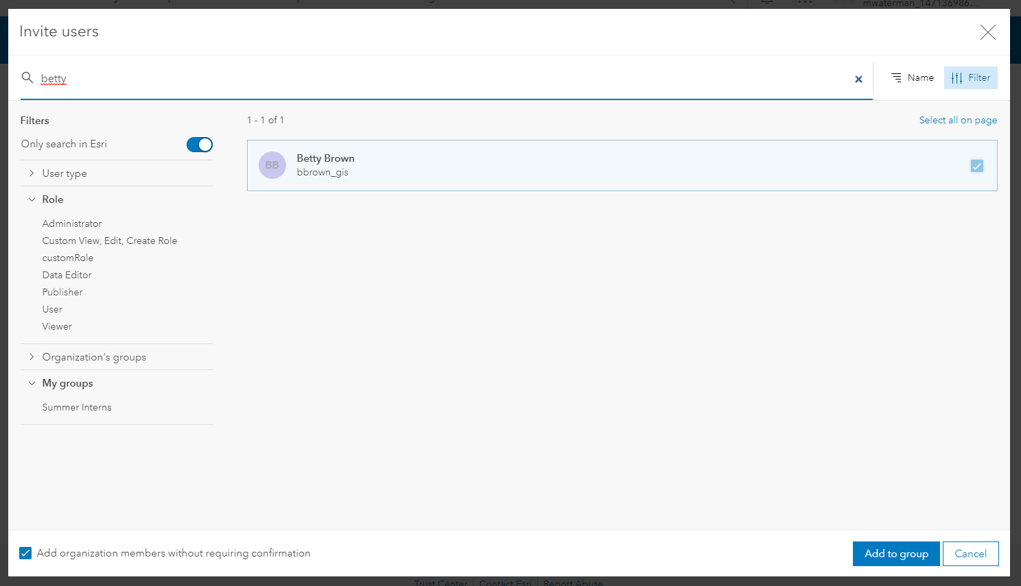 You can filter invites by role, user type, existing groups in the organization, or a combination. These filters are especially useful for large organizations with diverse groups of employees, departments, or projects. For example, in nearly one click, all members with the Field Worker user type could be added to a group for a hydrant inspection project. Or, you could invite all interns to an administrative group to manage their licenses and content over a summer term.