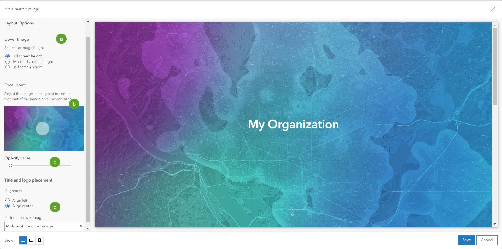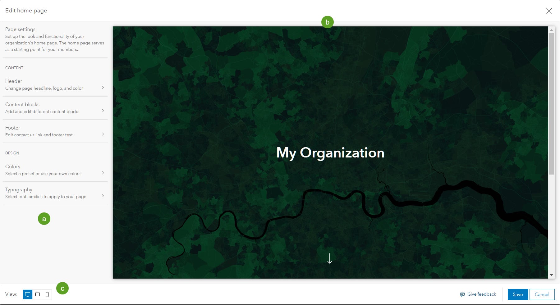 The home page can also deliver helpful resources and content for organization members and public visitors. You can configure a modern and professional-looking home page that reflects your organization’s branding and mission and showcases the maps, scenes, apps, and layers that are most important to your community.