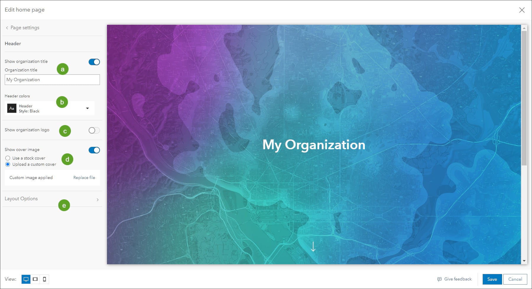 The home page header can include any of the following elements: a cover image, an organization title, and an organization logo. These configurations are found in the header panel as shown below:
