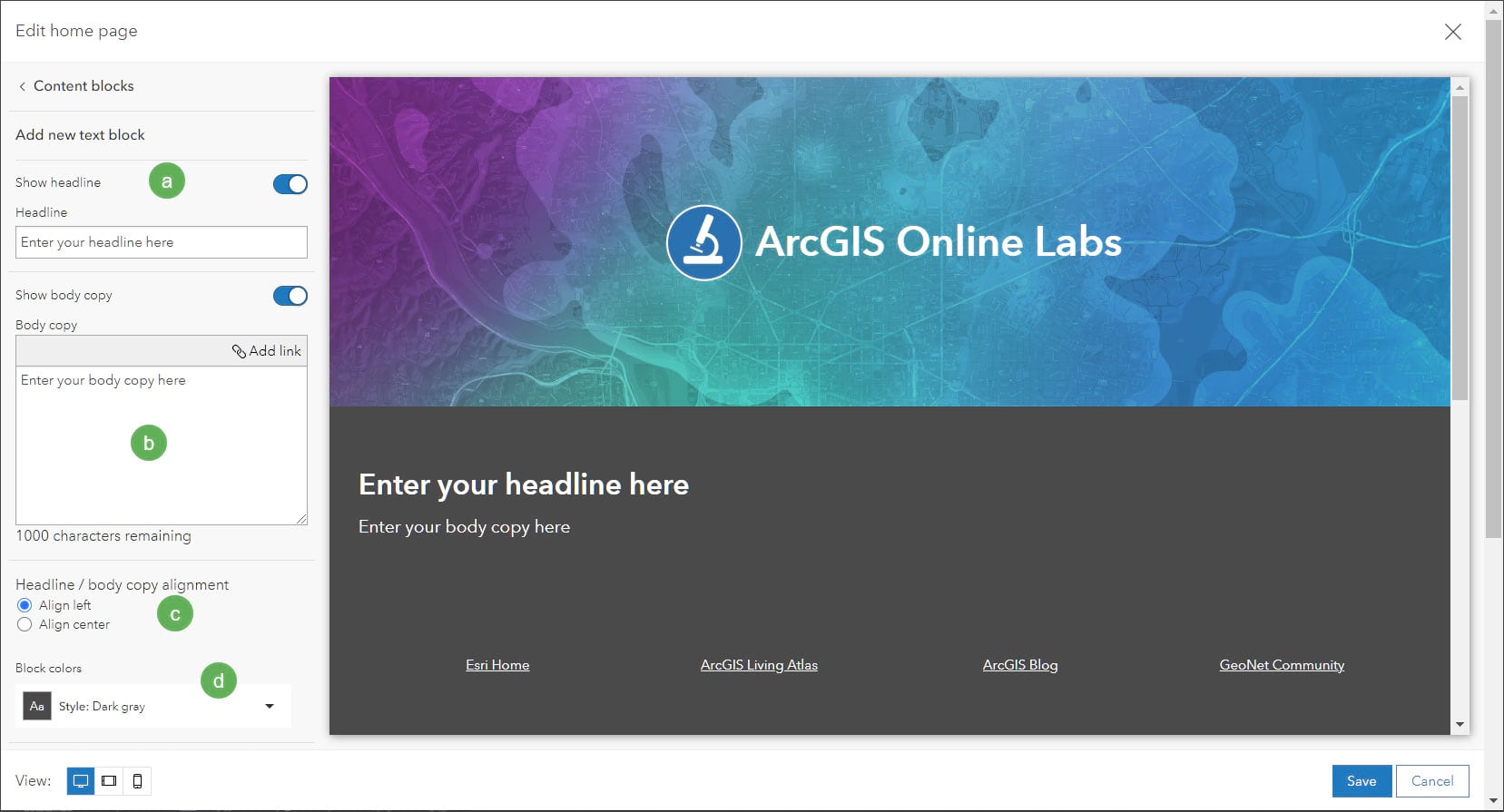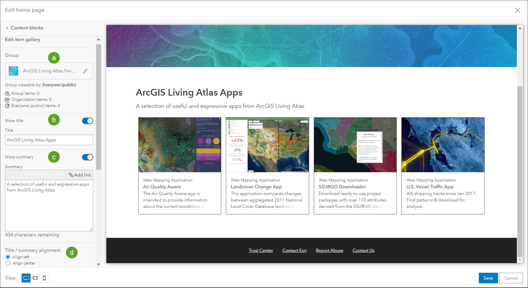 Use text blocks to configure headlines and other text-based content about your organization. Configure item galleries to showcase maps, scenes, apps, and other content items. Use link blocks to help users discover content or other destinations.