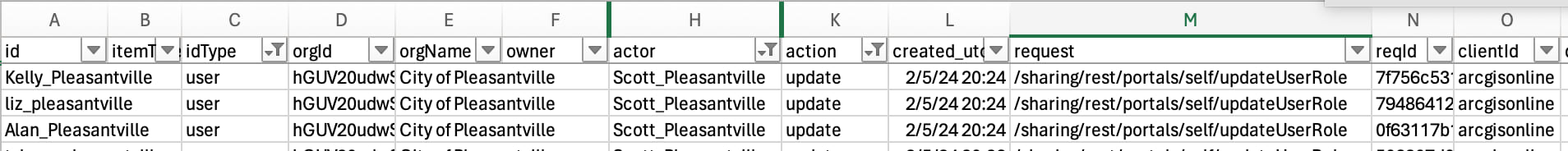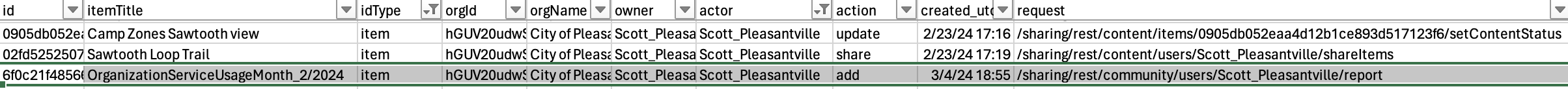 Like any good history, the activity report contains columns of information that can be used to explain the who, what, when, where, and why of each event. Although sorting and reading through a CSV file line by line may not be your favorite way to spend a Tuesday afternoon, understanding what the fields and values mean can help identify events and answer questions about your members and content in ArcGIS Online. You can use the activity report as a tool to find specific event entries, or ingest the CSV file with scripting, alerting administrators of specific events.