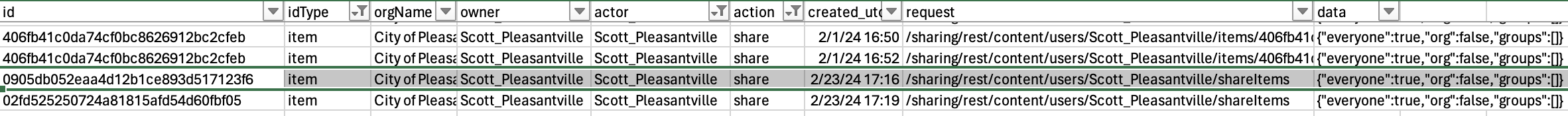 Although action specifies the type of action performed in the event—for example, create update and share— the request and data field can also be helpful to understand more about the action. The request and data fields further refine the specific action, by displaying the request sent by ArcGIS Online during the event and the data (when appropriate) that is changed. This information can be particularly helpful when identifying sharing changes to an item (Fig 3).