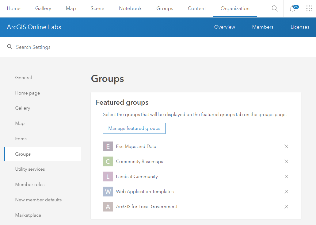 By default, the Groups tab displays a collection of groups selected by Esri. You can replace the defaults with your own groups, or combine them. To configure the Group gallery, follow these steps.