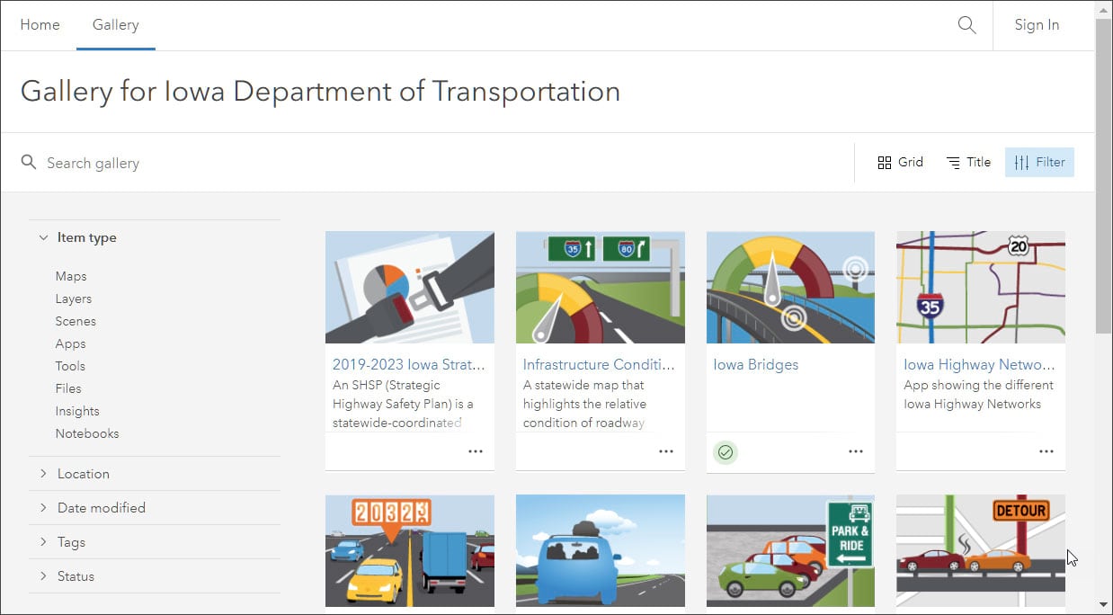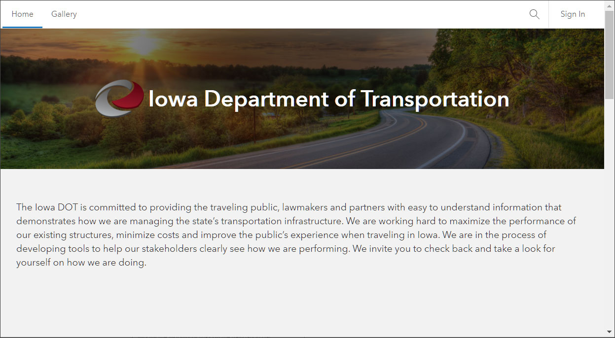 The Iowa Department of Transportation organization home follows best practices. Not only is the home page cleanly designed, it also includes customized Navigation bar link visibility and a configured Gallery link as described above.