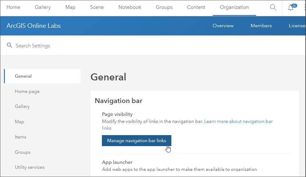 Step 1 — In your organization Settings, go to the General tab and locate the Navigation bar section. Click Manage navigation bar links.