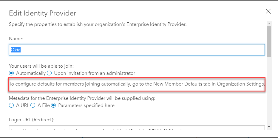 For organizations with enterprise logins configured and the option to allow users to join automatically, the defaults set on the New Member Defaults tab are automatically applied when a member joins. Using this setting ensures that the user is ready to use ArcGIS Online immediately without needing to make additional configurations after the username is created.