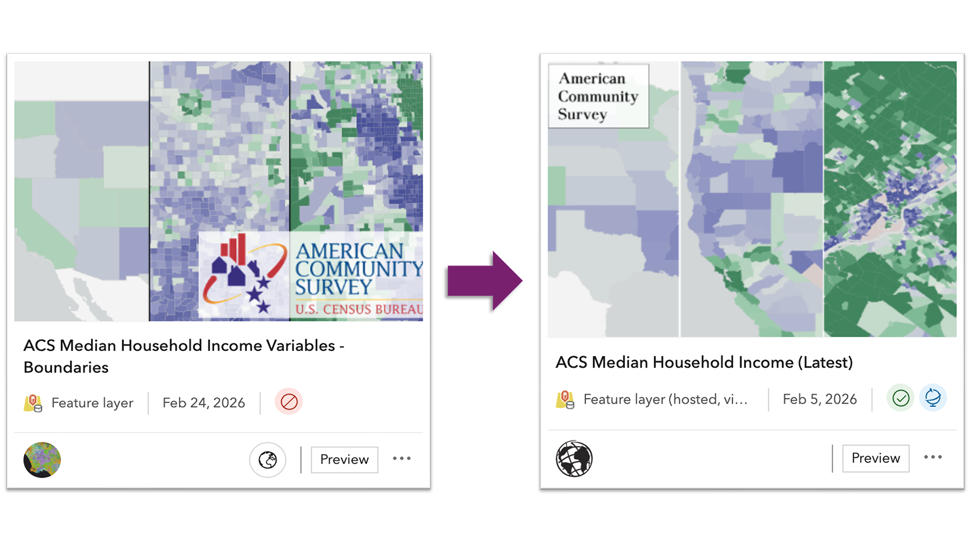 With the latest update to the American Community Survey (ACS) 5-year estimates, the Living Atlas Policy Mapping team has transitioned from updating Hosted Feature Layers in place to delivering content through Hosted Feature Layer Views. This new approach provides a more stable method of updating the 114 items in the ACS Collection. Now that the new views are available, users may want to update their existing web maps, dashboards, or other apps to take advantage of the latest data.